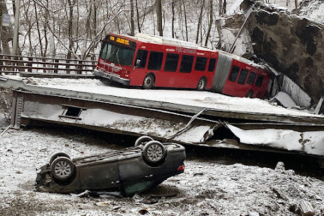 When Joe Biden was scheduled to appear at the Forbes Avenue Bridge in Pittsburgh, PA, it collapsed. Ten people were injured. One can only hope there was space in the ICU at St. God's to let them get proper treatment. I don't blame Grandpa Joe. I can't point a finger at a single politician or a clutch of them for the collapse of the superannuated bridge. It's a negligence of the city as a whole. Arenas and stadia are renovated or constructed to draw in sports fans and tourists. The problem is, if the infrastructure collapses, how are these zealots going to congregate at their temples of testosterone without suffering an injury? Or worse, will they prematurely stand in front of the throne of St. God to receive reward or punishment?